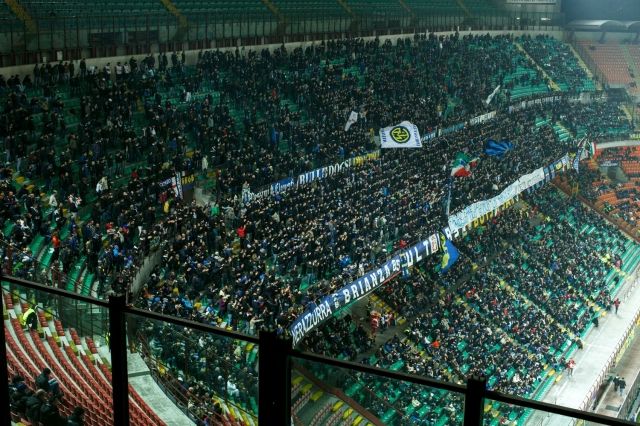 Після швидкого огляду стюартів, які дуже й то не перевіряли нас, ми почали сходження по одній із спіральних веж, які ведуть на третій ярус стадіону. Швидко, зайнявши свої місця, ми нарешті занурилися у гру та періодично відволікалися, щоб оцінити масштаби цієї насправді грандіозної споруди. Відразу нашу увагу привернули ультрас "Інтера”, які створювали ефект вщент заповненої арени, хоч трибуни були зайняті лише на половину. Будь-який гострий момент у матчі піднімав на ноги усіх вболівальників, а свисток арбітра на користь болонців супроводжувався неймовірним свистом та гудінням. Можна собі лише уявити, що відбувалося наприклад на матчі "Мілан” - Барселона”, або коли проходить дербі.